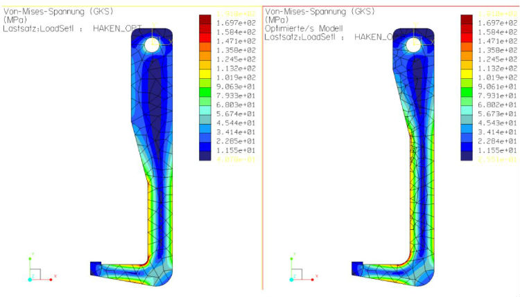 The left crane image is the crane’s form before optimization whether the right side is the optimized crane. The maximum stress (shown by red color) on the optimized crane is distributed uniformly, so the max stress is not concentrated on the corner only.